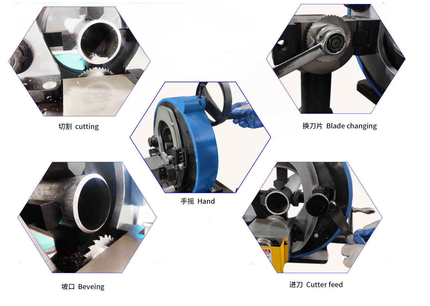同心圓的夾具,能有效的避免管子在夾緊時產生變形,雙刀頭的設計,刀片與管子的夾緊距離小,避免薄壁管子在切割時產生振動,同時可滿足切割彎管,短管的需示,無需底板繁瑣步驟,設備座增加鎖緊孔洞,可直接固定,手搖旋轉輪式切割,使切割輕松省力,速度均勻,從而增加刀片的使用壽命,整個冷切割的過程不產生火花,切口垂直,可以直接對焊,切割過程可以不需要冷卻液,管子待焊部位沒有污染,保證了焊接質量。